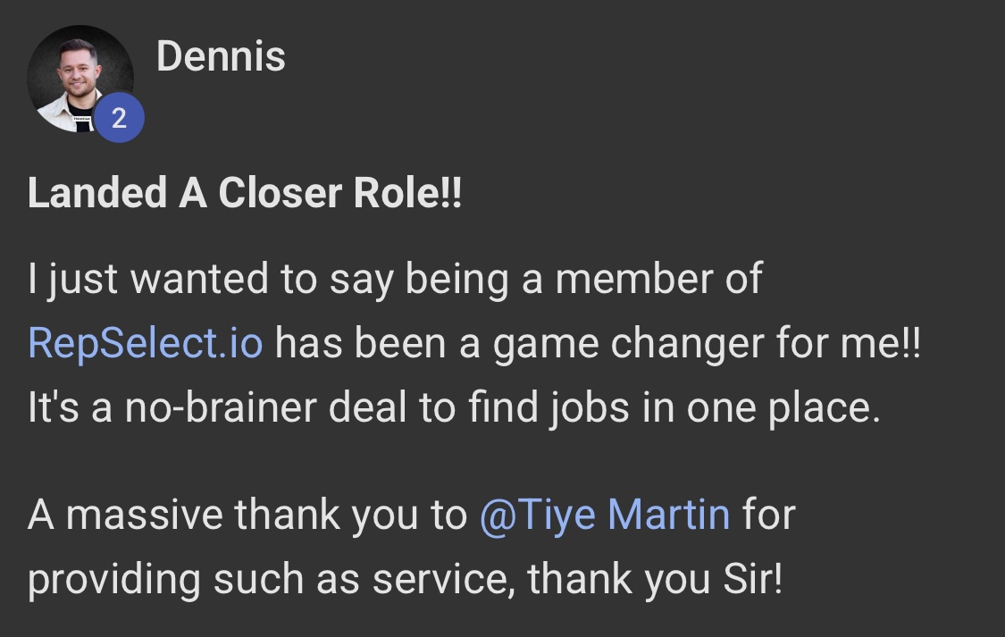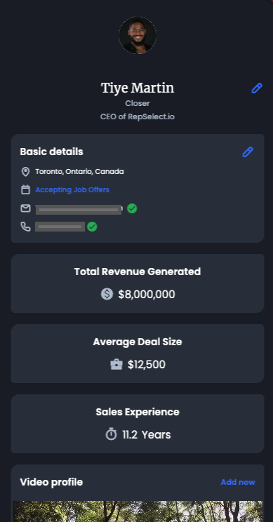 Create a comprehensive sales profile detailing all of your skills and experience. Shareable in job applications both on and off RepSelect.